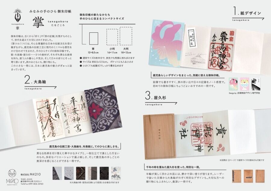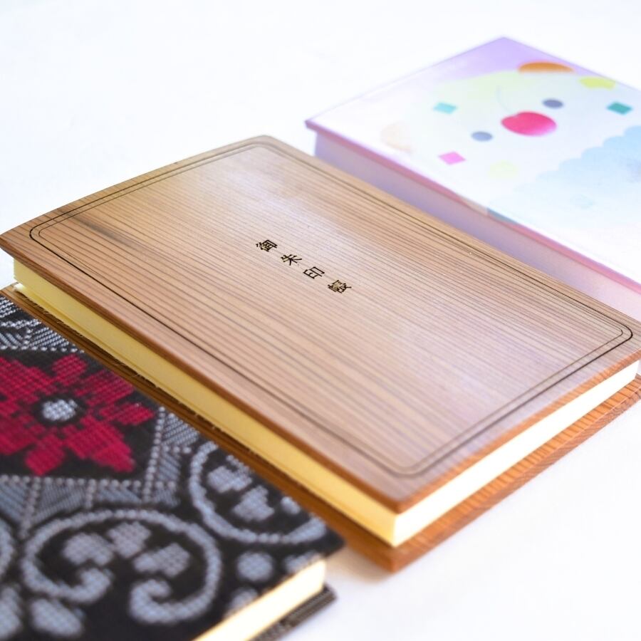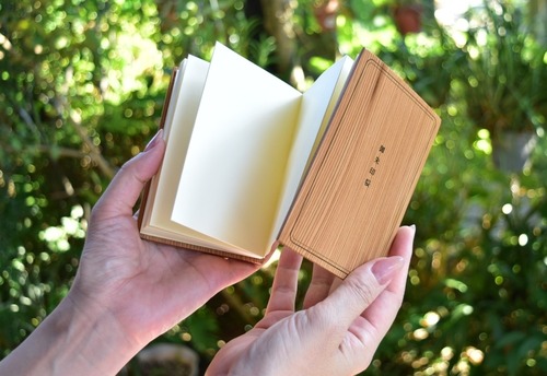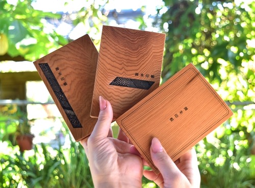 屋久杉の静かな木肌に、切り抜きの窓からのぞく大島紬がアクセントとなり、木のぬくもりと織物の華やぎが美しく調和します。祈りの場へ向かう気持ちや、旅の途中で出会う静かな時間をそっと支えてくれるような一冊です。自然の力強さと鹿児島の伝統工芸、その両方を感じられる特別な仕上がりです。